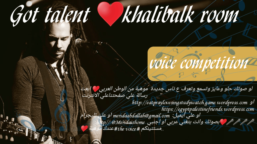 لو صوتك حلو وعايزتغني او بتعرف تعزف اي اله موسيقي او الجن او تألف شعر او تلقي شعر وعايز حد يسمعك ويساعدك و كمان يتعاون معاك و كمان تستمع بوقتك وتعرف ع ناس جديدة موهبة من الوطن العربي♥️ ابعت رسالة علي صفحتناعلي الانترنت http://eatpraylovesingstudywatch.game.wordpress.com او https://egyptpalestinefriends.wordpress.com