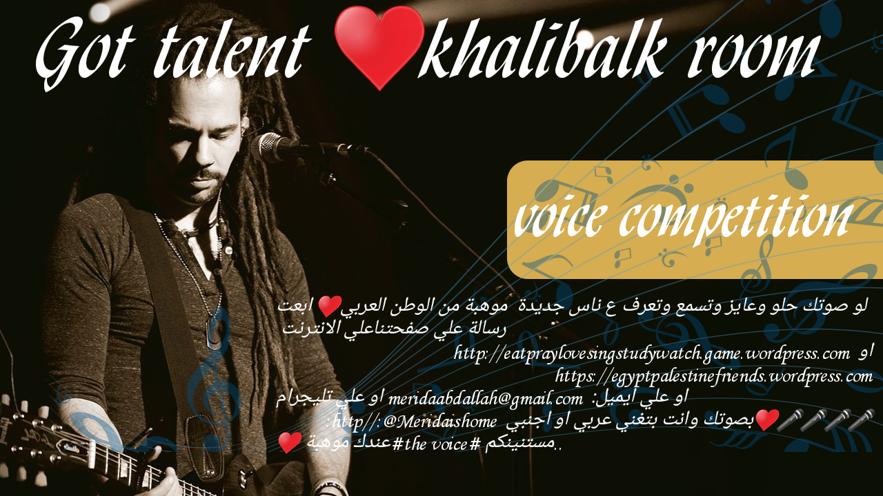 ..join our.singing voice competition by sending us in here at the face book message with avoice record of any song you love ♥️♥️♥️joined ♥️عندك موهبة واتعرف علي ناس كتير موهوبين وبيعرف كمان يعزفوا ويغنوا♥️♥️موهوبين وبيعرف كمان يعزفوا ويغنوا♥️♥️♥️ مستنينكم♥️ اعرف اكتر عن مسابقة الغناء والعزف واضغط ع وبيعرف كمان يعزفوا ويغنواالمعلومات ابعت رسالة هنا أو علق بتم وقول لأصحابك اهلا بيكم …انا🎤https://www.facebook.com/merida.brave.37819message with avoice record of any song you love ♥️♥️♥️.او زوروا موقعنا ع : http://eatpraylovesingstudywatch.game.wordpress.com